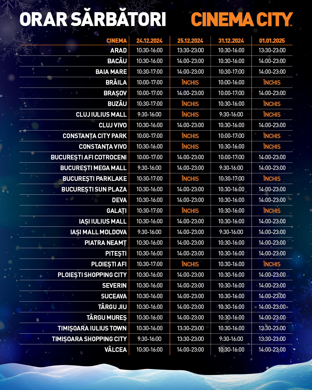 PROGRAMUL CINEMATOGRAFELOR CINEMA CITY ÎN PERIOADA SĂRBĂTORILOR DE IARNĂ